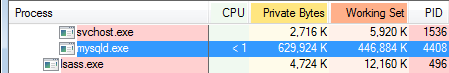 The following image shows the mind-boggling amount of memory occupied by MySQL 5.6 server on Windows 7 64-bit.