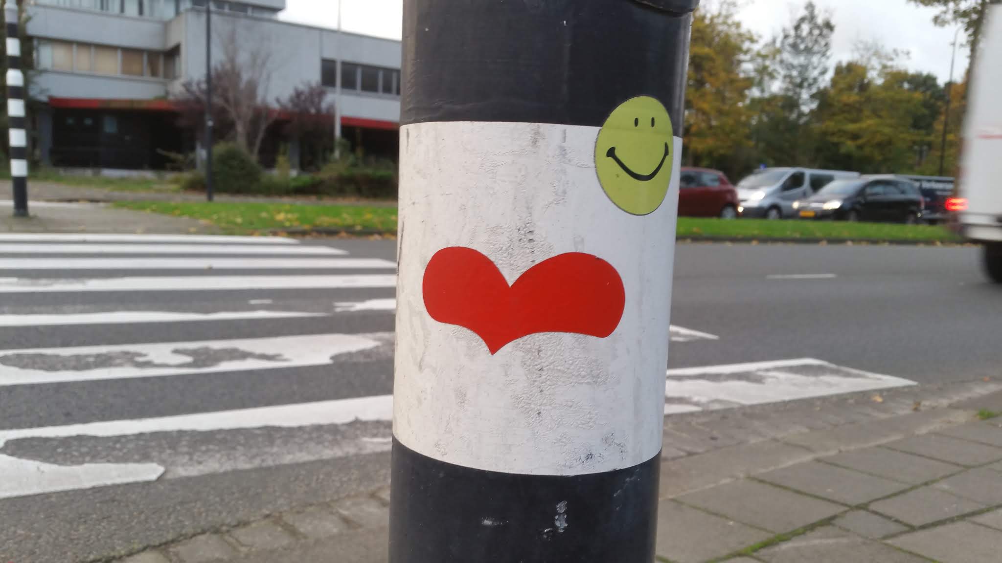 So, after a bit of research it seems that the heart had been placed on the traffic light post back in 2015, and then in 2016 the post was probably hit by a car and became slightly slanted, so today there is no heart sticker on it anymore, but it is standing straight again, so it has probably been replaced.