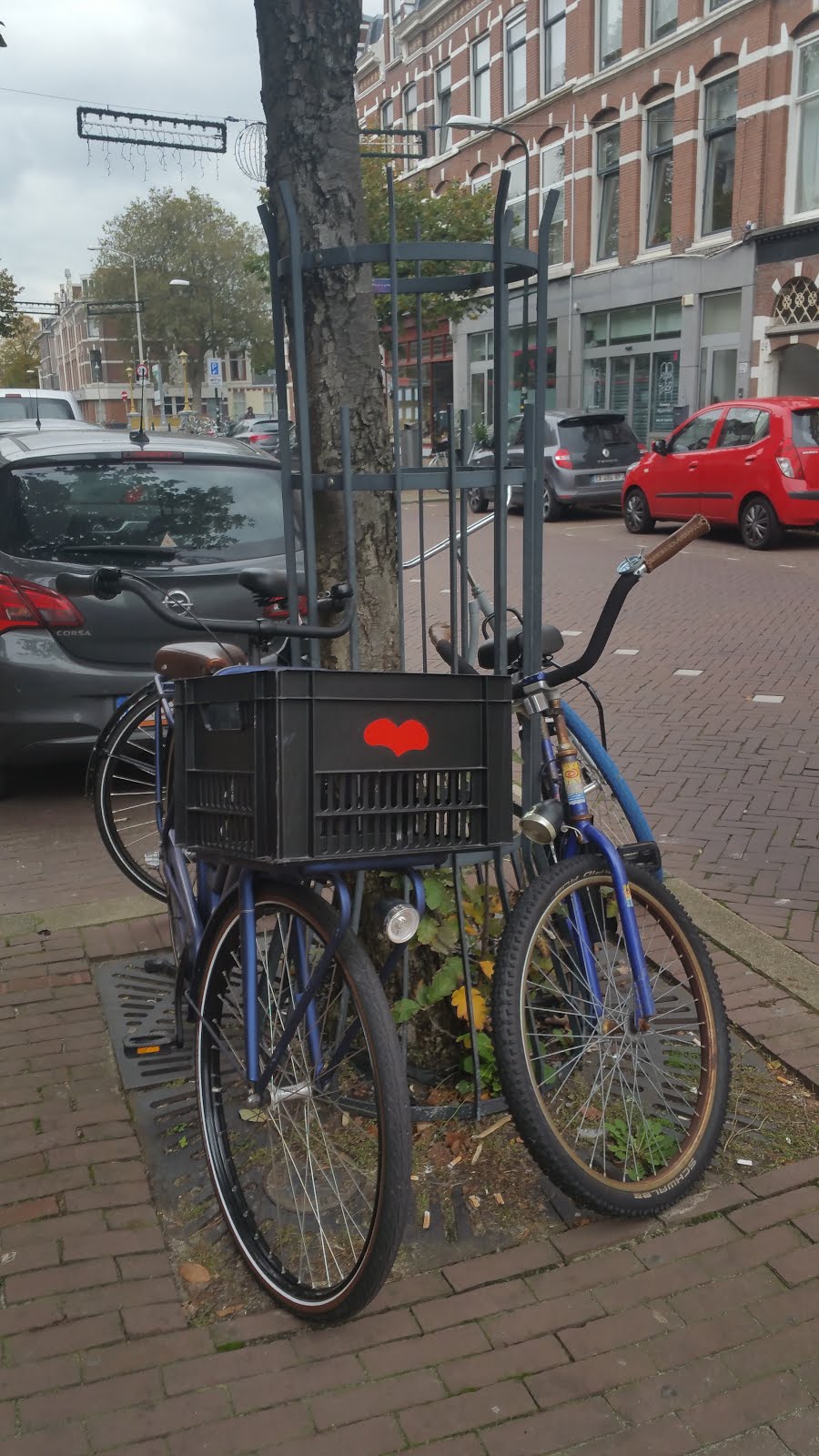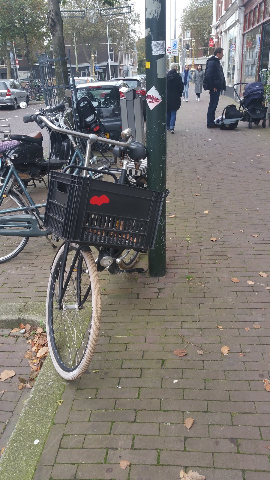 It may be difficult to see it in the picture, but there is a bicycle parked on the other side of the street, that has a box in front of the steering bar, and on that box there is a big red heart sticker!