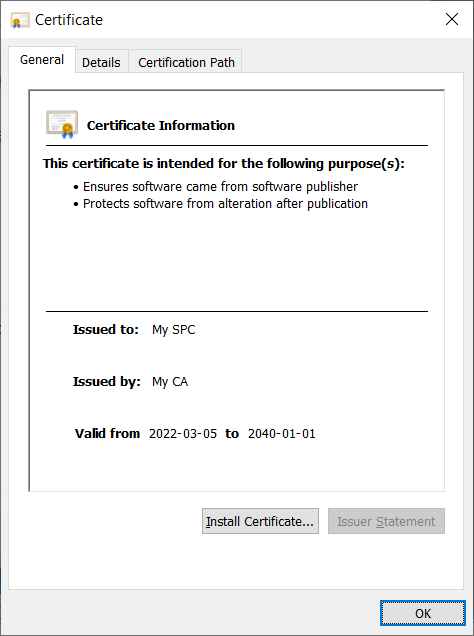 Of course, Windows is finding the digital signature to be "OK" only because I have installed this self-created and fictitious "My CA" Certification Authority. On a customer's computer it will most probably not show "OK" unless you purchase a certificate from a valid Certification Authority, but for the purpose of passing the silly virus checks on virustotal.com, it is okay.