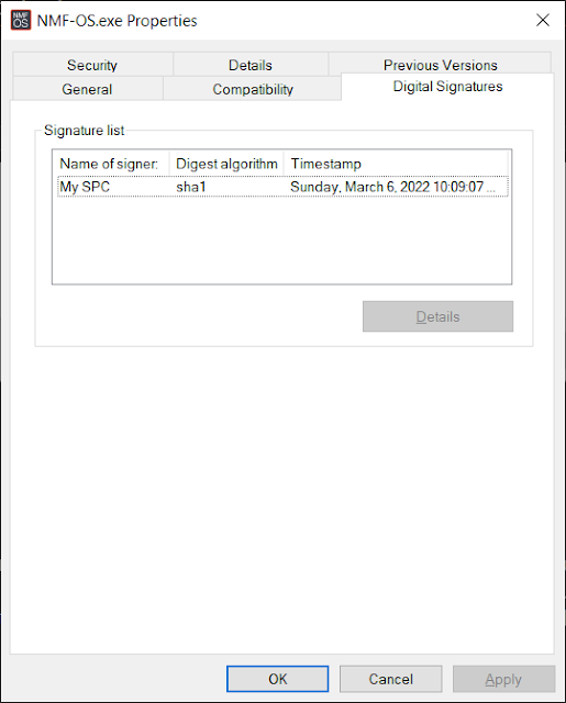 Using the Windows File Explorer to look at the properties of the signed executable, we see that there is now a new property tab called "Digital Signatures":