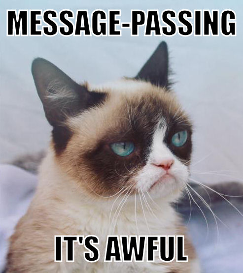 | Mandatory grumpy cat meme: "Message-Passing: it's awful" by michael.gr |