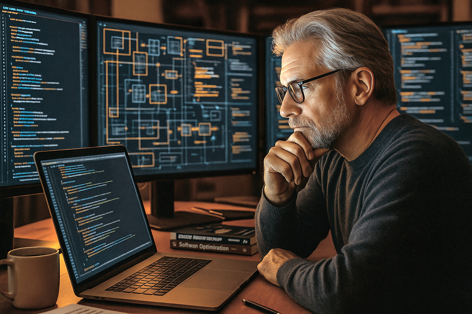 Cover image generated by ChatGPT, and then retouched by michael.gr. The prompt used was: "Please give me an image conveying the concept of highly complex and highly technical software development. Make it in landscape format, of photographic quality, with warm colors" and then "Please make the programmer look more senior".